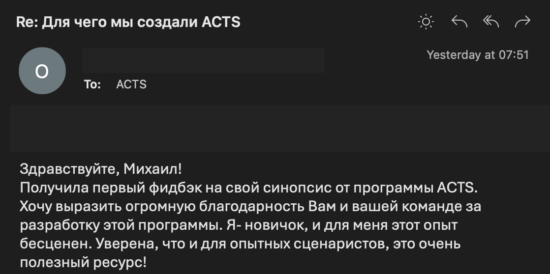 С правилами совпадать не нужно, они универсальны. И их ACTS считывает четко. Он способен проверить сцену или синопсис на некий «средний стандарт адекватности». Причем без личностных искажений, которые в работе с живым человеком бывают часто. ACTS не будет раздражать ваш слог, у него нет больных тем или профессиональных травм прошлого.